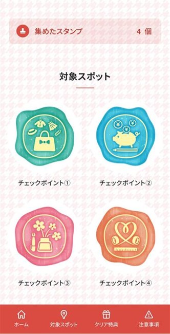STEP2:会場内①~④のチェックポイントに向かい、「対象スポット」メニューから各ページにある「スタンプを押す!」ボタンを押してください。