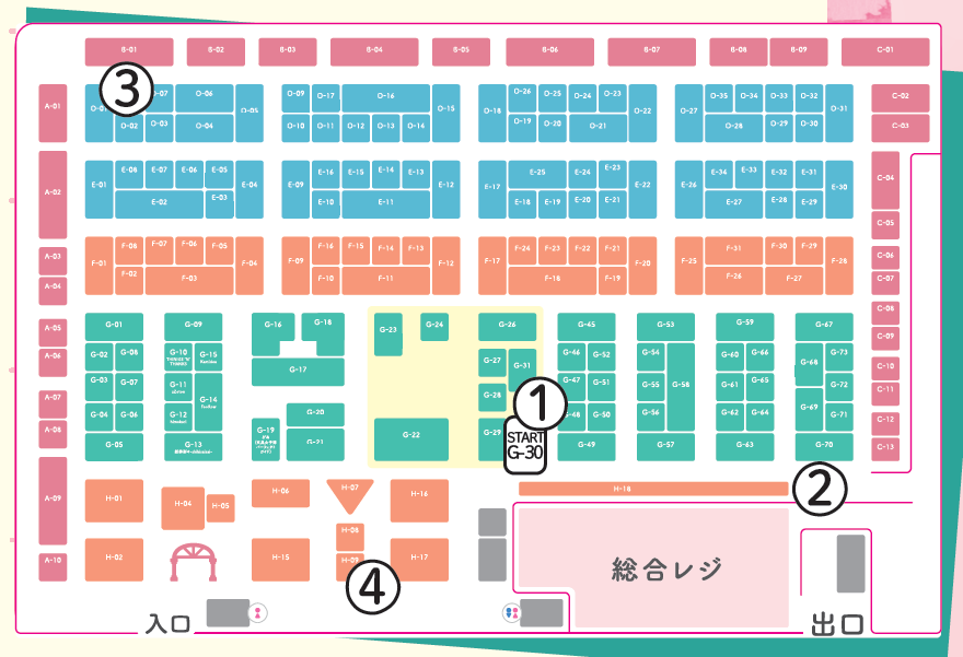 スタート地点【G-30 三菱UFJ銀行「エムット」ブース】にて参加登録後、会場内のチェックポイントを回って4つのスタンプを集めましょう!