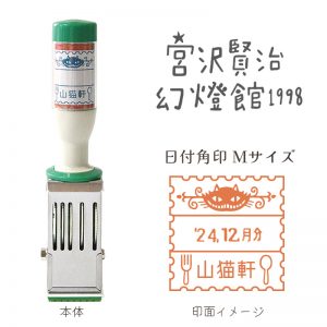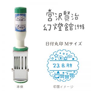 宮沢賢治の世界観をモチーフにした盤面約36mmの日付印。高級感あるデザインと耐久性を備え、手帳や日記の装飾などの日常使いに最適です。箔押しの限定パッケージ入り。
