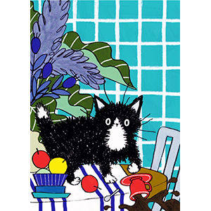 手のひらサイズのノートなので、小さい部屋にいる小さなネコをどこにでも持ち歩いていけるようなイメージで描きました。 コーヒーはこぼしても、水槽の金魚にはイタズラしないいい子です。