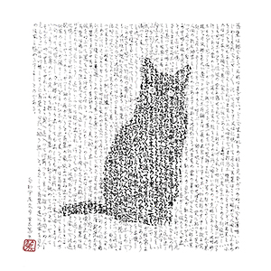 夏目漱石の代表的な小説『吾輩は猫である』の冒頭部分を手書きしながら、同時に黒猫の姿を描きました。