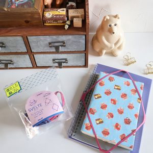 変わった形の輪ゴム「スヴェルト」。本やお道具箱、ファイルを留めたりいろんな場面で使えてとっても便利。