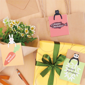 動物型クリップが付いたミニバースデーカードです。メッセージを贈るだけではなく、クリップを使ってブーケやギフトにカードを留めたり、贈った相手にクリップを使って楽しんでもらうことができます。
