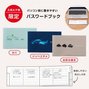 増えるパスワードの管理に便利なパスワードブック。カバ、ジンベエザメ、お好み焼きの3柄。