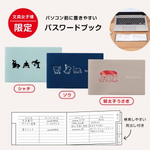 増えるパスワードの管理に便利なパスワードブック。シャチ、ゾウ、明太子うさぎの3柄。