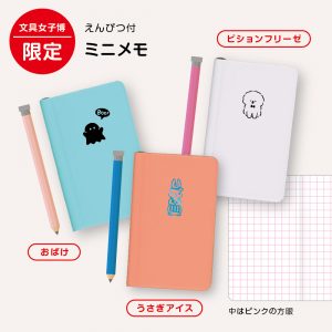 鉛筆付の小さなメモ、ミニメモは今回からの文具女子博限定柄の3柄で販売いたします。