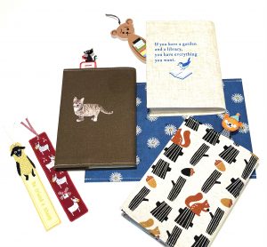 布地製の文庫用のブックカバーといろんな素材とタイプのブックマーク。読書生活を彩るグッズたちです。