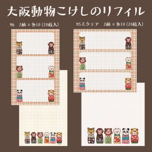 大阪をイメージした動物こけしの穴なしリフィルメモ。M6とM5スクエア、それぞれ2種類ずつ、片面印刷で20枚入り。