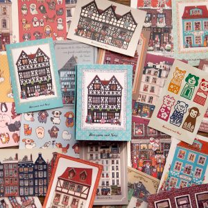 切手のパターンにヨーロッパの家屋やキャラクターたちを組み合わせました。工作やブックカバーなどに活躍する可愛いデザインペーパーです。