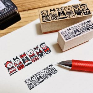 福岡をイメージした動物こけし(あまおう、博多どんたく、にわか面、博多織、博多祇園山笠、とんこつラーメン)のラインスタンプ。