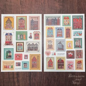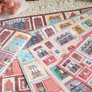切手のパターンにヨーロッパの家屋やキャラクターたちを組み合わせました。工作やブックカバーなどに活躍する可愛いデザインペーパーです。