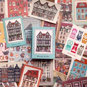 切手のパターンにヨーロッパの家屋やキャラクターたちを組み合わせました。工作やブックカバーなどに活躍する可愛いデザインペーパーです。