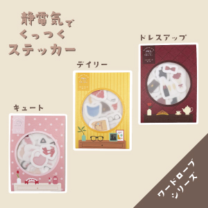 静電気でペタッと貼れるステッカーに小さめワードローブシリーズが仲間入り。糊あとを気にせず楽しめます。