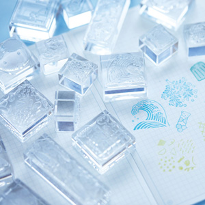 すべてのパーツが透明で作られたスタンプ「氷印」のバイキングができます。スタンプと同柄の文具女子博限定アクリルキーホルダー付き!