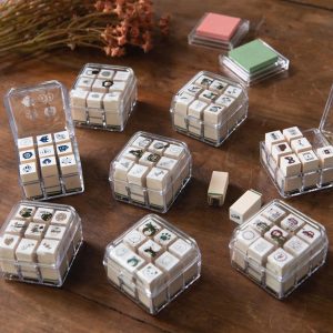 小さいスペースでも使いやすいミニサイズの木製はんこ。持ち運びできるかわいい収納ケース入り!