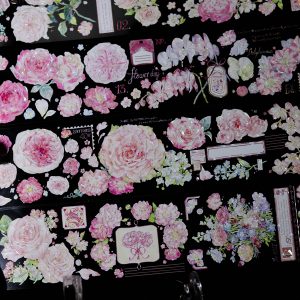 中国イラストレーター「B加索」デザインのテープ製品で、ピンク色をベースに、春の花々が一斉に咲くイメージ。