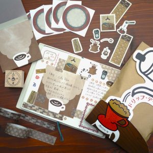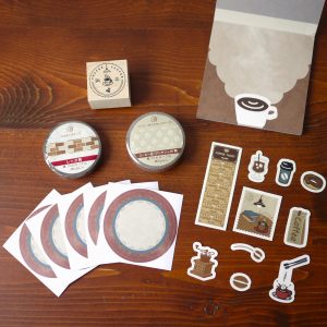 コーヒーをテーマにした手帳デコアイテムのセット。マスキングテープ、シール、はんこ、メモ帳がセットに。