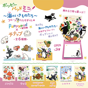 人気の海の生き物たちとフルーツがポップアップする付箋。ほっこりやわらかいイラストが魅力のチナップさんのデザイン。