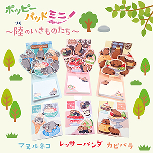 「レッサーパンダ」「カピバラ」「マヌルネコ」とスイーツが可愛くポップアップするふせん♪デザインは、ふんわりやわらかいタッチが魅力のたけもんさん。