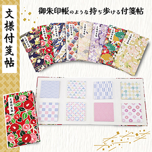 日本の伝統文様のデザイン付箋(30枚)が8種類ついている御朱印帖のような付箋帖。表紙は友禅和紙を使用。