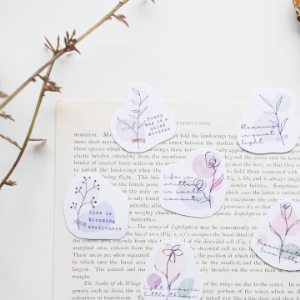柔らかな水色のコラージュシールです。手書き風モチーフと英字が、貼るだけで手帳を軽やかな雰囲気に