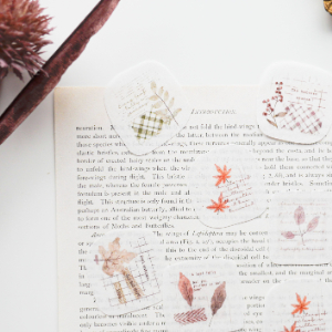秋冬の葉とヴィンテージ英字を組み合わせたフレークシールです。落ち着いた、大人可愛い雰囲気に