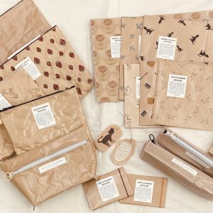 片面が撥水加工のクラフト紙で紙のポーチやペンケースをミシンで製作しています。紙ならではの手触りをお楽しみ下さい。