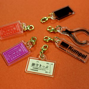 御守りの言葉を乗せたきっぷを、様々なパーツとともにセットしました。