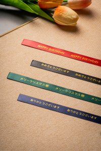 青文字や赤文字など、色ごとに用意された巻き。用途に合わせる色を選び、手帳やラッピングに使えます。
