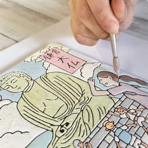 Point1 ご当地クリエイターが描いたイラストをもとにスペインタイルを制作。このタイルをペノン独自の加工技術で1/3サイズに再現。