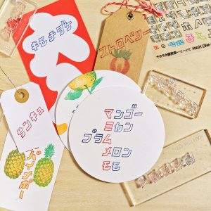 レトロなカタカナフォントのミニサイズのスタンプ。メッセージやラベル・プレゼントのタグにも合います。