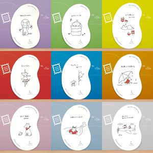豆型のことわざエールカード。ことわざメッセージとおとぼけた動物が頑張るあなたの背中を押してくれます。